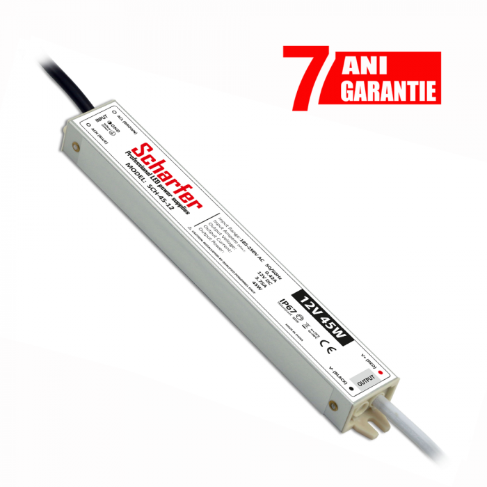 Sursă de alimentare bandă Led 12V profesională marca Scharfer: este proiectat pentru a fi utilizat atat la interior cat și la exterior în conditii de mare umiditate (grad de protecție IP67). Poate alimenta benzi Led de putere până la 45W, cu un curent maxim de 3.75A.