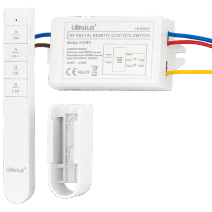 Tip: RF Sarcină pe canal: ≤500 W - sarcină activă (lampă incandescentă); ≤300 W - sarcină capacitivă (lămpi CFL și LED) Rata IP: IP20 Dimensiuni receptor: 101/48/25 mm Dimensiuni telecomandă: 140/20/19 mm Distanță de lucru: până la 30 m (în zona deschisă) Tensiune de lucru: 2 baterii (incluse) Suport pentru montare pe perete